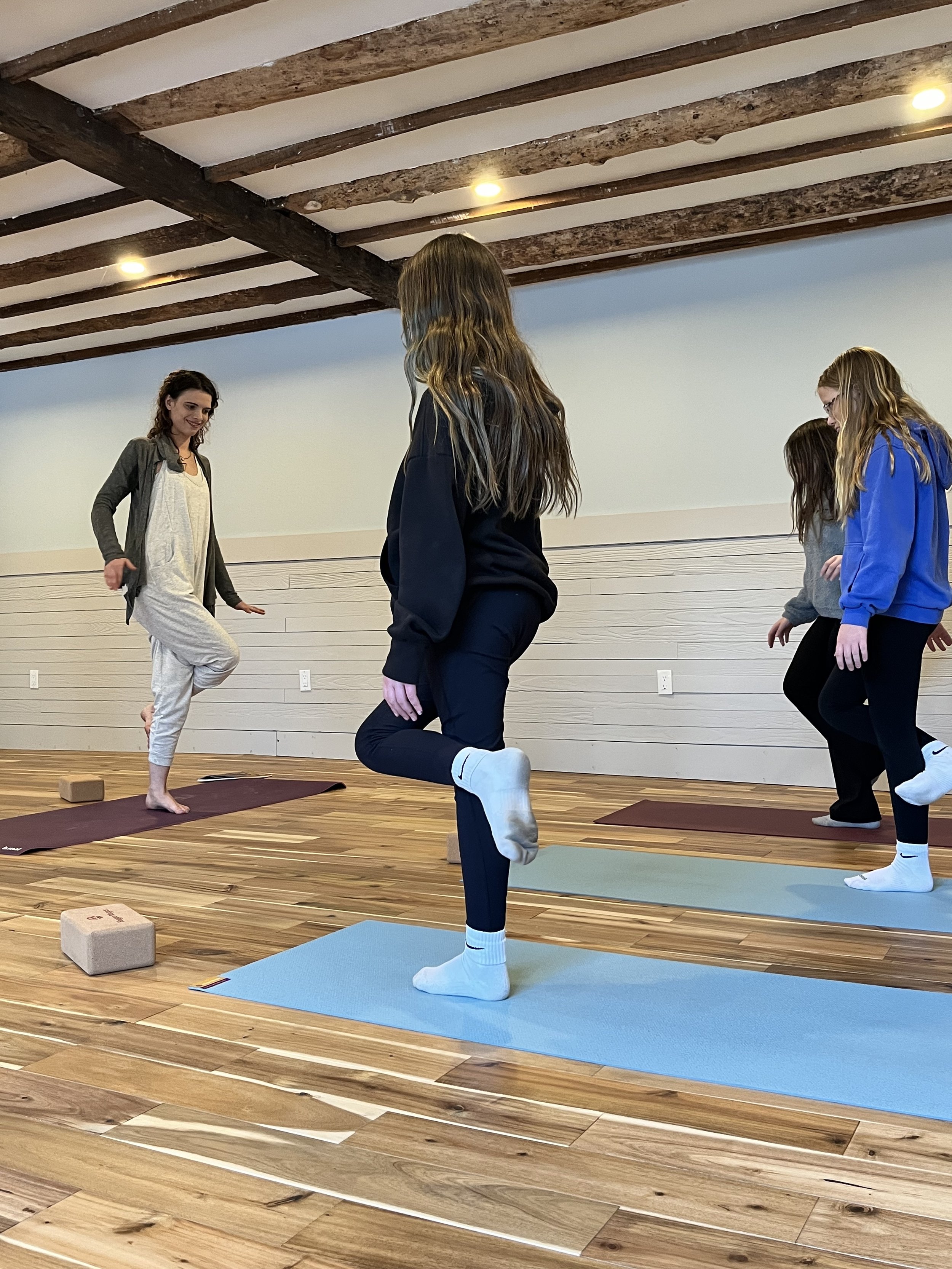 Alyx Sellers pictured here, guiding students into a challenging balance pose, Garudasana “Eagle.”